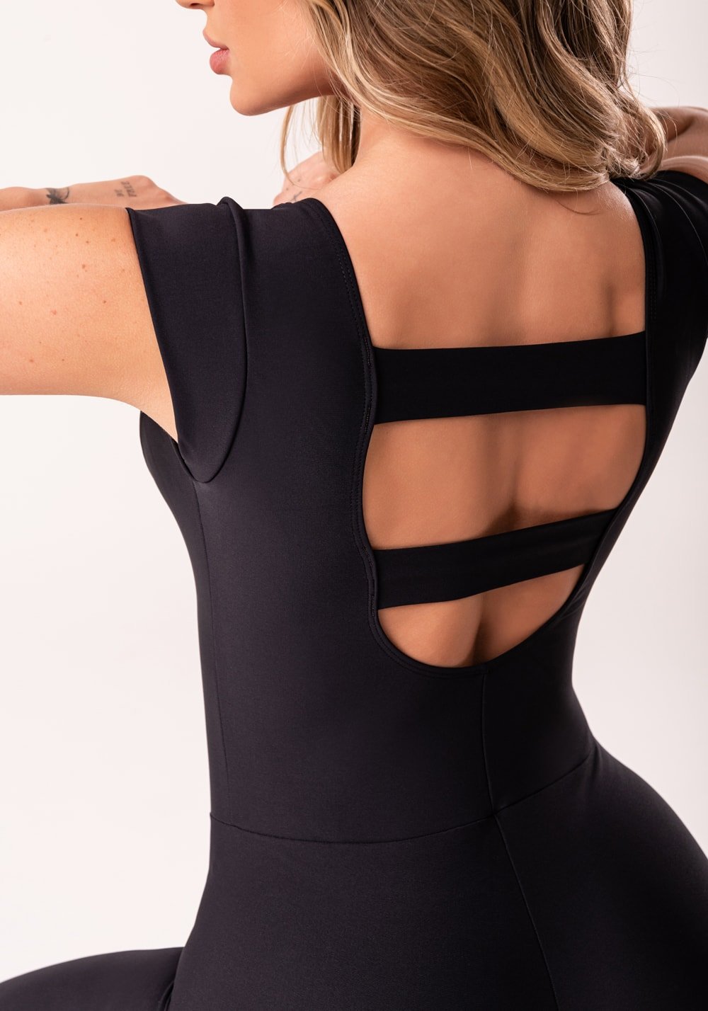 Macacão fitness feminino preto alça dupla e elástico vazado action