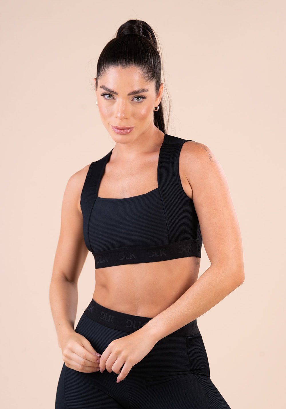 Top fitness feminino preto canelado com elástico e detalhe costas action